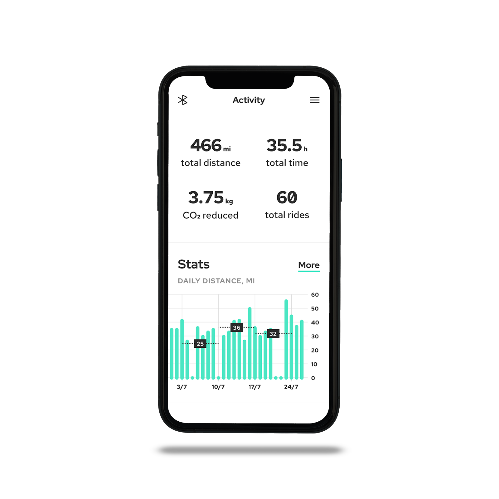 In Ride mode, the app displays real-time speed, battery stats, time, distance, calories, location and more to let you keep track of all important performance metrics and optimise your ride.